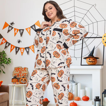Conjunto de ropa de casa holgada fina de primavera y otoño para mujer al por mayor de fábrica, pijamas de cintura elástica Hallowmas
